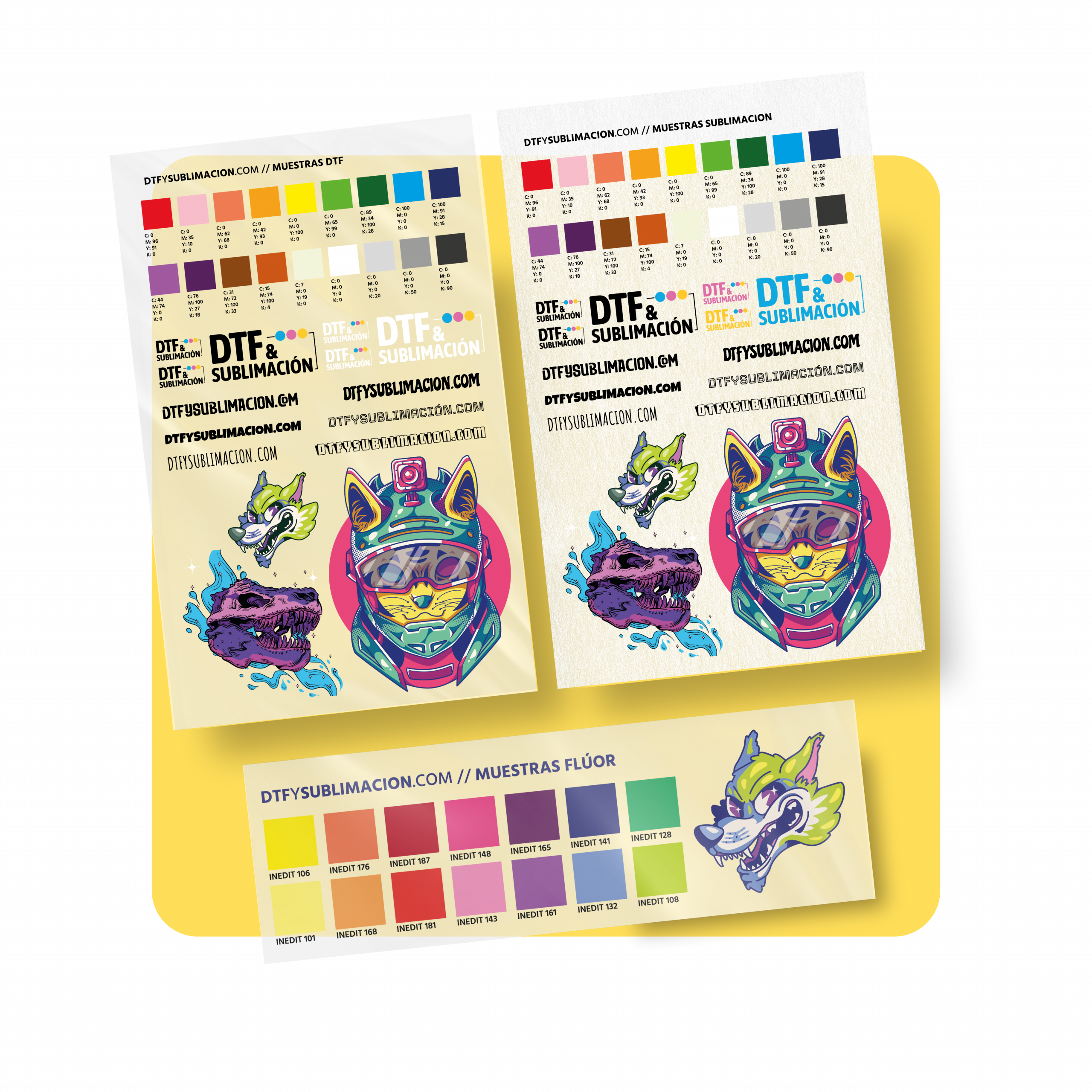 Cada lámina contiene el diseño de nuestro logotipo, impreso con nuestras tintas y papel de máxima calidad. El objetivo es que puedas comprobar el nivel de detalle, intensidad de color y definición en diferentes tipos de aplicación.